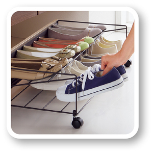 シューズボックス下のスペースを有効活用。天然木の前板で目隠ししながら、すっきり収納。