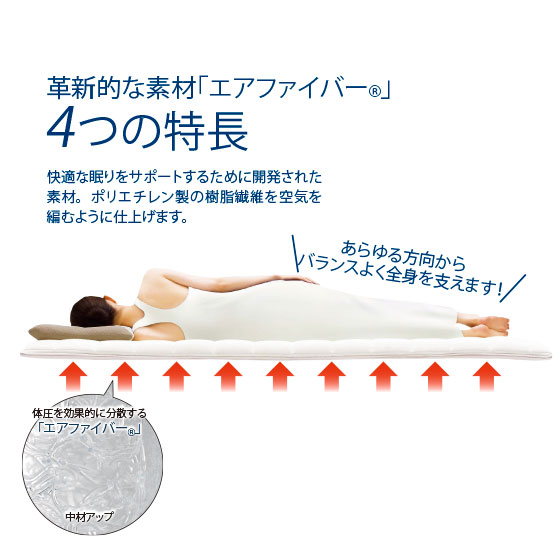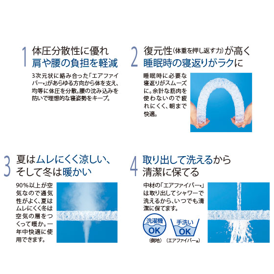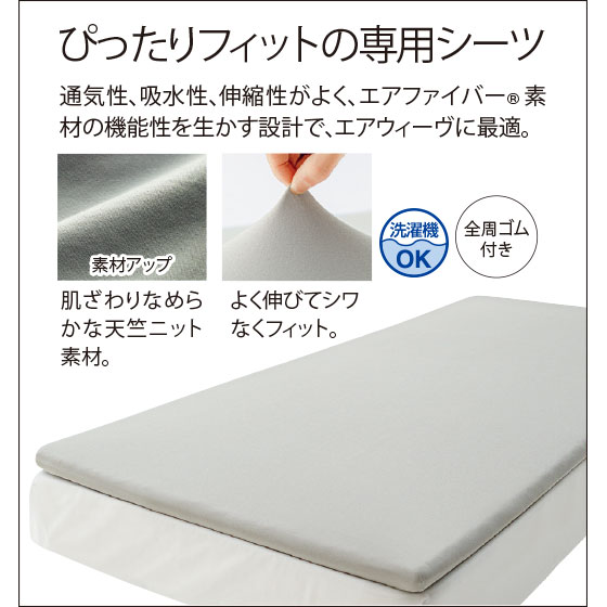 ●素材:側地=ポリエステル100%、中材(エアファイバー)=ポリエチレン100%、専用シーツ=綿95%・ポリウレタン5%
