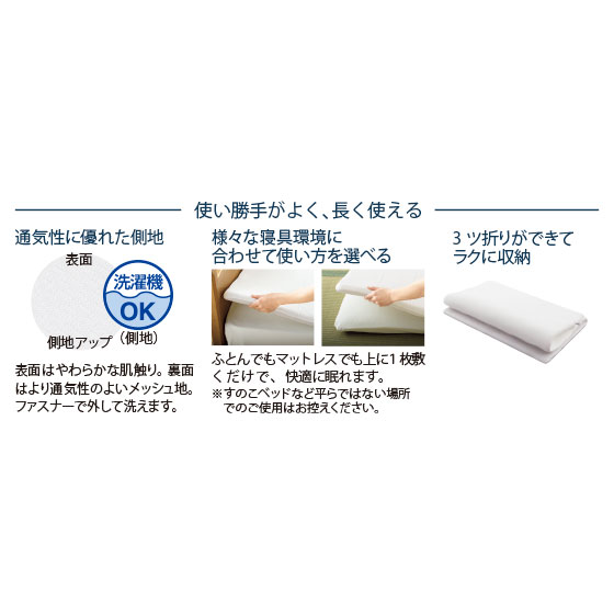 ●サイズ:幅97(シングル)・120(セミダブル)・140(ダブル)×長195×厚4.5cm、専用シーツ=幅100(シングル)・120〜140(セミダブル・ダブル)×長195〜210cm