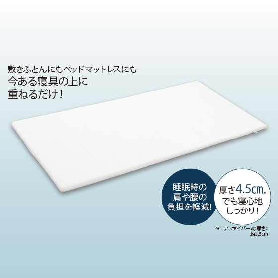 ふとんで寝ている家族が、腰や背中が痛いというので調べていたら、このエアウィーヴにたどり着きました。実際に使用してみると高反発で体を軽く押し返してくれる感覚があり、寝返りがしやすく驚きました!今あるベッドやふとんに使えて便利です。しかも様々なアスリートの方が支持していることも、採用の決め手となりました。