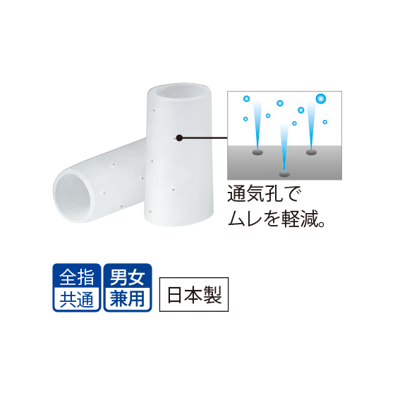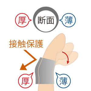 痛む指もしっかりガード。厚みの異なる円形断面。厚い部分は接触による痛みを緩和させ、薄い部分は曲げ伸ばししやすい構造です。