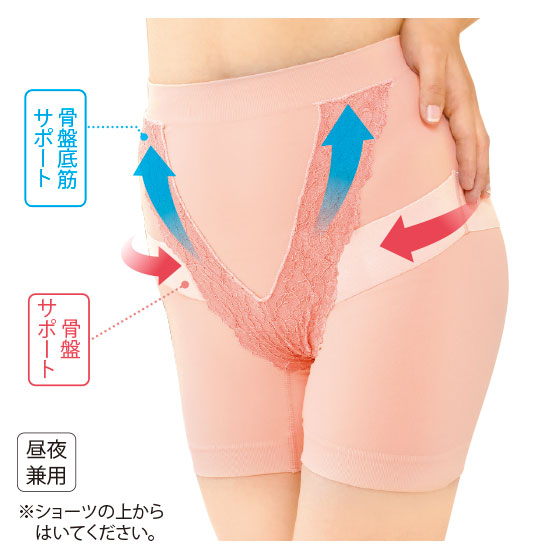 気になる尿漏れや頻尿は、加齢や出産による骨盤底筋のゆるみが原因のひとつといわれています。本品はおしゃれなガードルタイプのサポーター。V字型のストレッチレースが前と後ろから骨盤底筋をキュッと引き上げ、加圧パッドで膀胱回りを押し上げるダブルサポートで不安を和らげます。苦しくないからおやすみ中も使えます。