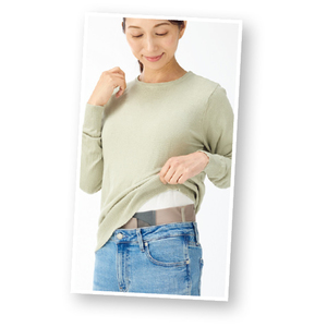 カラダにぴったりフィットする素肌感覚の腰ベルトです。最大の秘密は、厚さ約0.35mmという極薄素材。薄くても頼もしい伸縮性で、腰をしっかり引き締めます。軽くて薄いからアウターにもひびきにくく、自然な着用感でお出かけの際のおしゃれも楽しめます。