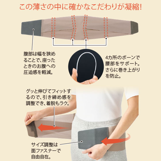アウターにひびきにくく、おしゃれも楽しめる。薄くても頼もしい腰ベルト。
