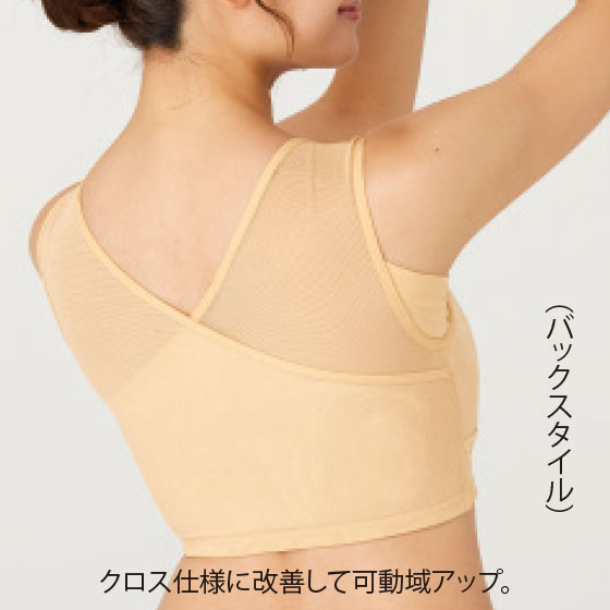 ご好評いただいた「胸を小さく魅せる楽々さらしブラ」を、組合員さんのご要望にお応えして、動きやすさ、着用のしやすさ、背中をメッシュ仕様にするなど、改良してさらに快適に。