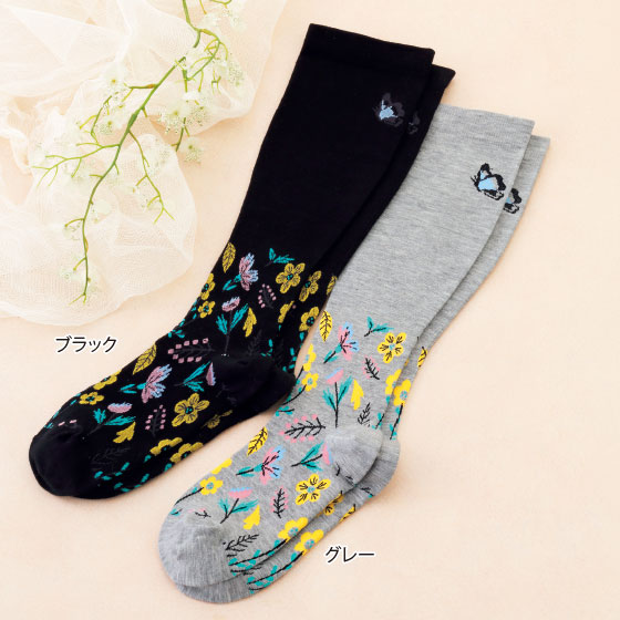 着圧編みハイソックス(花と蝶柄)
