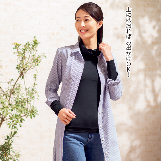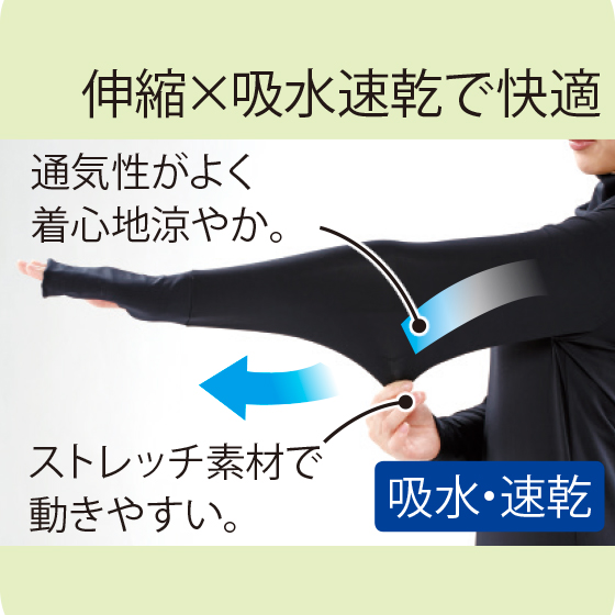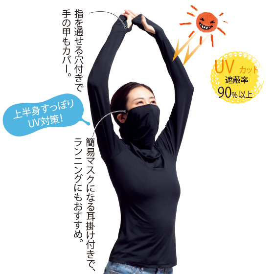 あれこれ塗ったり巻いたりしなくても、上半身のUV対策はバッチリ!ネック部分はうっかり忘れがちなマスク代わりになります。薄くて通気性のよい吸水速乾素材なので、暑い日もさらりと快適です。