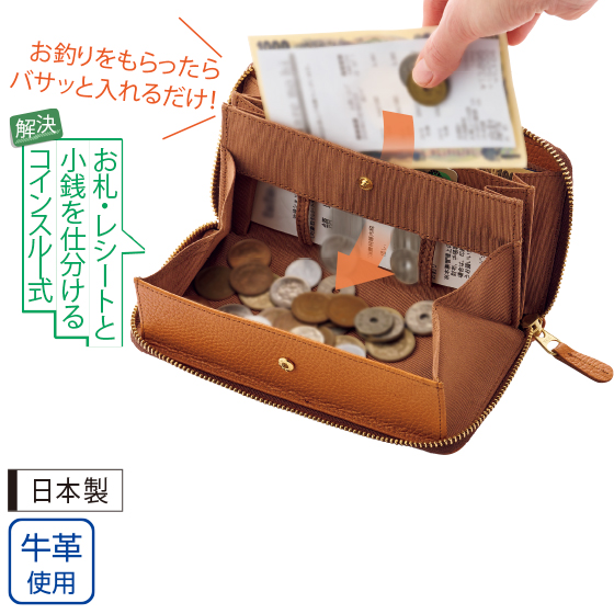 お金を出して、お釣りをしまって、買ったものはエコバッグへ… 混んでいるときなどつい焦ってしまうレジの前。本品があれば、もうモタつきません! お釣りとレシートを受け取ったら、全部まとめて入れるだけ。すると、小銭だけがすき間を通って小銭入れに移動。お札・レシートなどの紙類と小銭を自動で仕分けてくれます。小銭入れは大きく開いて見やすく、取り出しラクラク。創業60余年の革工房ナダヤの意欲作です。牛革のふっくらとした手触りも心地よく、長くお使いいただけます。