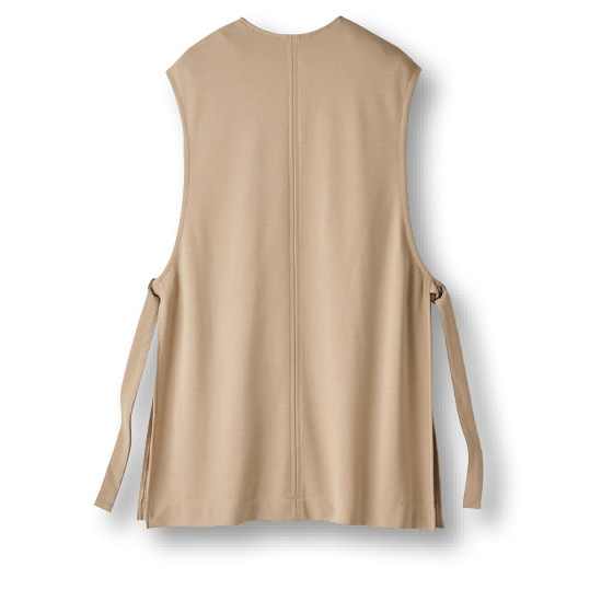 深Vネックとサイドの抜け感で、すっきり見えるトレンドベスト。レーヨン混のポンチ生地はしっとりタッチで落ち感があり、やわらかく着ながら体形カバーが叶います。