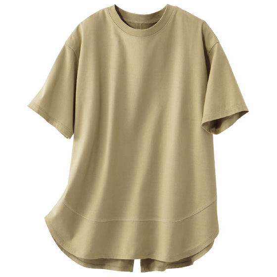 ハリ感と光沢感があるオーガニックコットン混を使用。すっきり見えてゆったりラク。腰回りがもたつきにくい裾スリット入り。