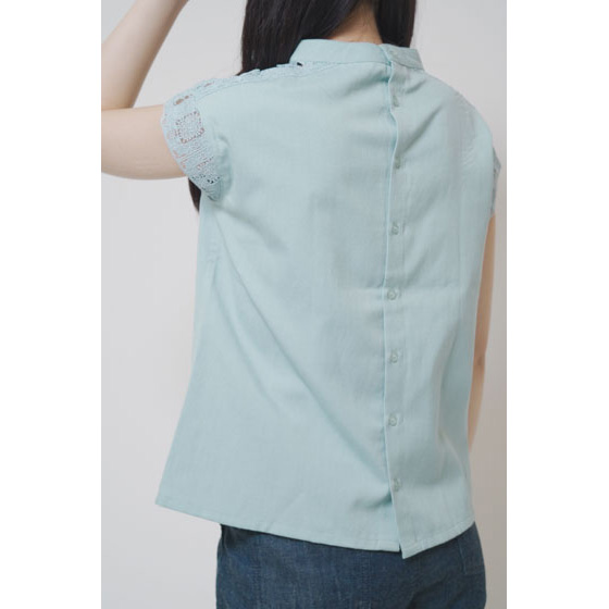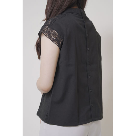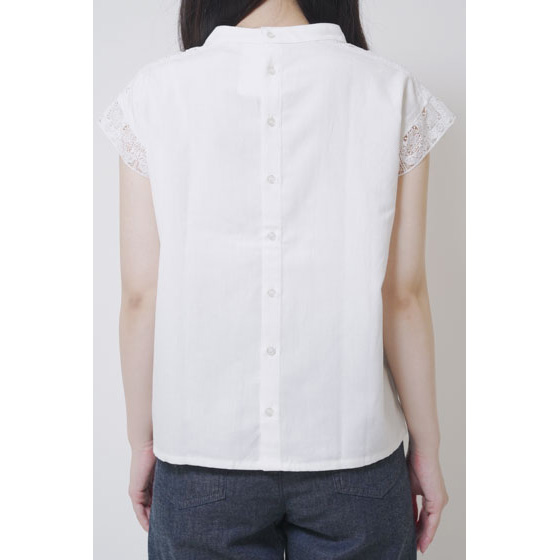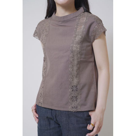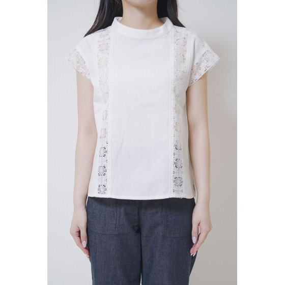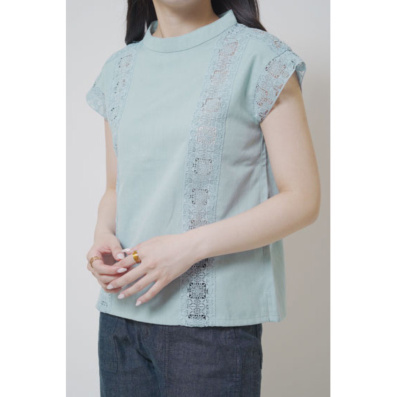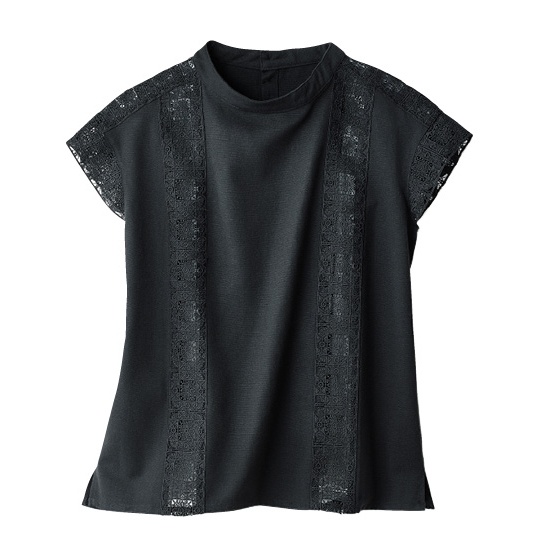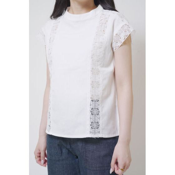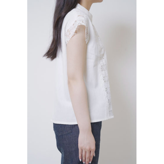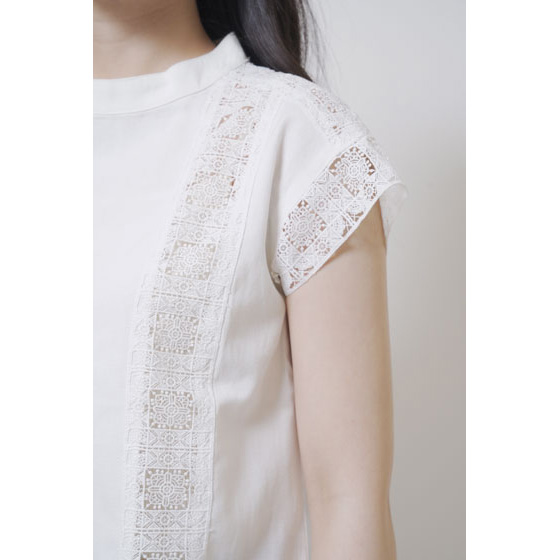 ほんのり透けたレース使いが、なんとも涼やか。甘い雰囲気になりすぎない幾何学模様で、夏の装いに上品なアクセントを加えてくれます。さらりとしたリネン混の身生地はほどよいハリ感があり、1枚着るだけできちんと見えも。体の線をカバーするシルエットにもこだわりました。
