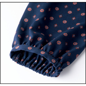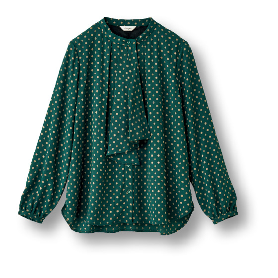 落ち感のあるしなやかなジョーゼット素材に、胸元のスカーフタイが上品な印象に。シックな配色の小紋柄プリントで、1枚でも着映え、デニム合わせでカジュアルコーデも。袖は裏地なしですっきり見え。