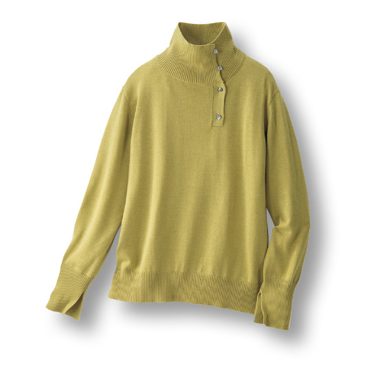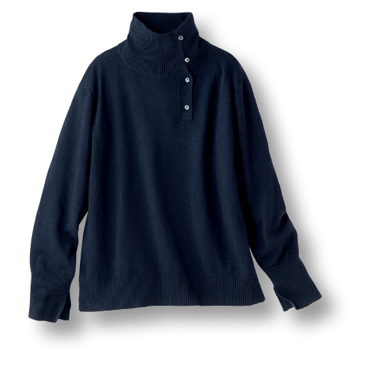 衿元に配したボタンの開け具合でデザインチェンジ!袖口は長めのリブにスリットを施し、手の甲までかかる仕様に。チクチクしにくいウール混で着心地もなめらか。