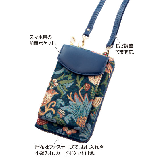 ●仕様:開閉=ラウンドファスナー式、ポケット=外部にホック式スマホケース1個、内部に札入れ2個・ファスナー式小銭入れ(仕切り兼用)1個・カード入れ6個付き