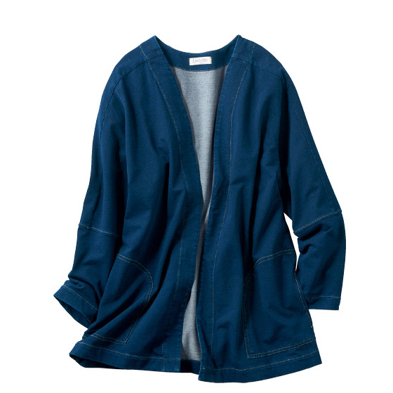 カットソー素材にインディゴ染めを施してデニムの風合いに。トッパーデザインだからサッとはおれて、ゆったりシルエットと長めの前裾で体形をカバー。