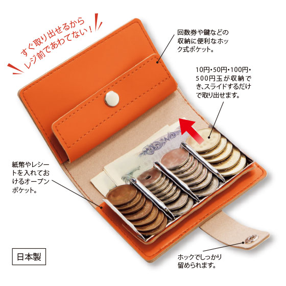 4種類の硬貨を専用のレールで仕分け収納できるアイデア財布。指先でスライドさせるだけで取り出せて、レジでもあわてずにすみます。ウォーキングやちょっとしたお出かけのお供に。