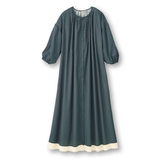 身頃は透け感のある2色のコットンボイル素材を重ねて、裾にバイカラーのアクセント。たっぷりのフレアで風が心地よく通り抜けます。ボリューム袖が腕を華奢見せ。