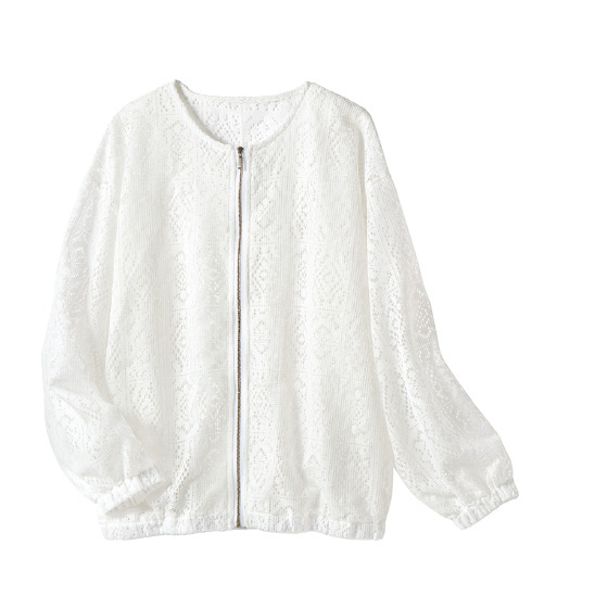肌やインに着た服を、ほんのり透かす総レースのブルゾン。丸みのあるシルエットも幾何学模様で甘くなりすぎず、コーデに華やぎをプラスできます。初夏の長袖服にはおっても軽やかに見え、真夏には風を通して涼しい着心地。
