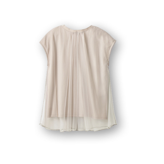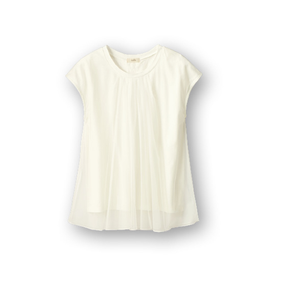 カットソーに透け感のあるメッシュチュールをレイヤード。胸元のタックで立体感が出るので、1枚で着映えが叶います。フレンチ袖で二の腕カバーも。