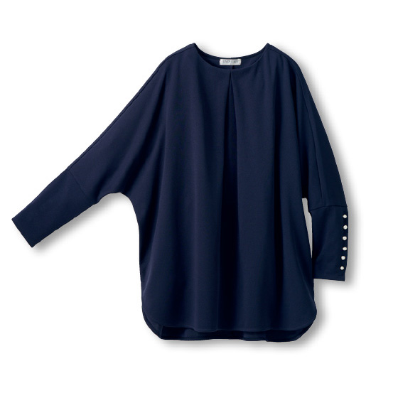 艶やかな表面感で落ち感もきれいなカットソージョーゼット素材。ドレープたっぷりのゆったりシルエットと袖口パールの効果で、上品に決まります。アイロンなしでもシワが目立ちにくく、サッと着てお出かけできます。