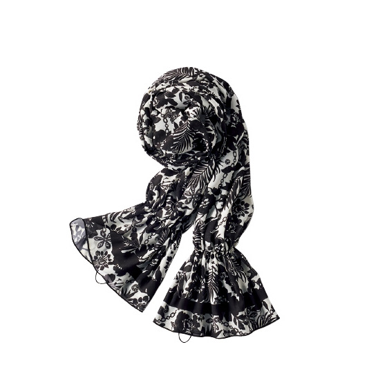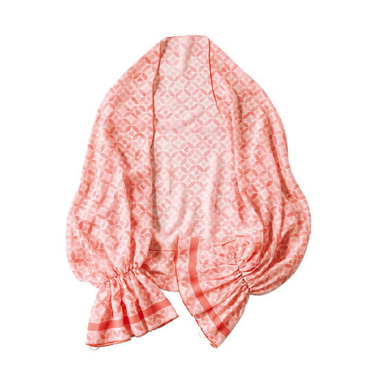 これひとつで、スカーフ風、肩掛けストール、はおりまで、何通りもアレンジ可能。バッグに入れても携帯しやすいサイズ感で、冷房や紫外線対策もできるから夏も活躍。袖口は手の甲を覆えるループ付きです。