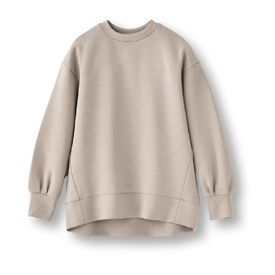 表地と裏地の間を中糸が立つように編み込むことで、2層の間に空気をため込み暖か。もっちりソフトな風合いで、体の線を拾いにくいハリ感もある素材です。
