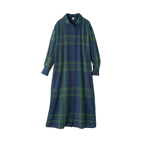 シーズンレスで着られる、やわらかな綿100%素材。まる衿が大人かわいく、Aラインシルエットで体形カバーも。はおりにもなるので長く活躍。