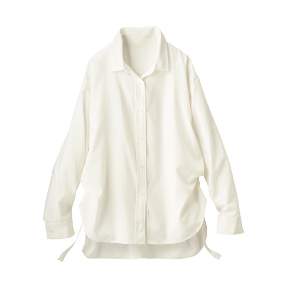 裾両わきのタブを留めて、タックデザインも楽しめる2WAYデザイン。ヴィンテージ感のある生地と相まって、1枚でサマになります。