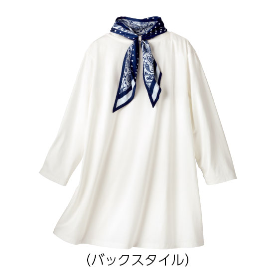 なめらかな光沢とソフトな着心地の綿100%素材。ふんわりと体を包むAラインシルエットの後ろにはスカーフを通せるラメ入りテープ付き。スカーフは表裏柄違いなので、アレンジ幅がぐんと広がります!