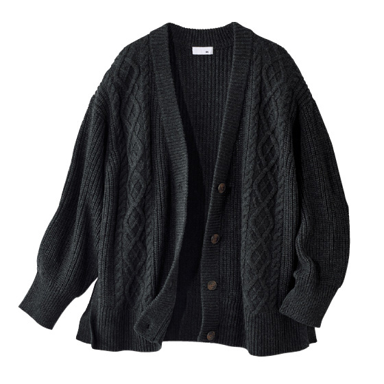 ふっくら編み上げたウール混ニットに、ケーブル柄のアクセント。ゆったりトップスの上にもはおりやすいサイズ感で、コートにはまだ早い時季に便利です。