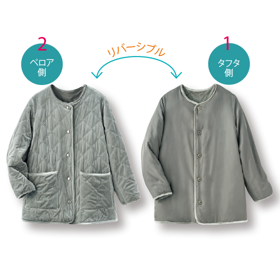 薄く中わたをはさんだ暖かなコートです。片面はベロアキルト、もう片面はステッチレスのタフタで、コーデに合わせて1着で2着分の着回し力。かさばるコート収納も省スペースですみます。ゆる服の上にも着られるゆったりしたサイズ感でヘビロテ。