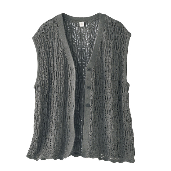 手編みのような風合いの透かしベストは、いつもの服に合わせるだけで華やかさがアップ。ドライタッチな質感で重ね着してもサラッと快適です。