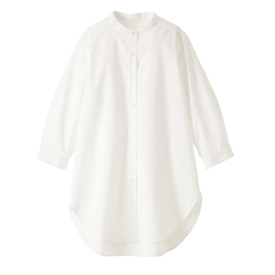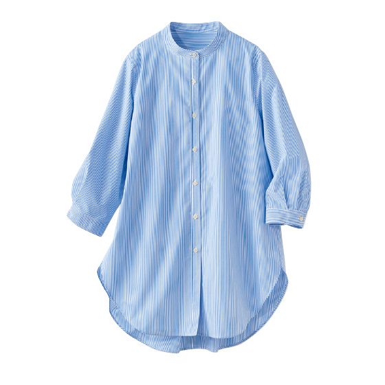 イージーケア機能糸「ソロテックス(R)」を使用。バンドカラーですっきり、ロング丈で腰回りをカバー。初夏から着られる7分袖です。