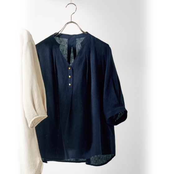 フレンチリネンのシャリ感と、レーヨンのしっとり感。2つの持ち味をミックスした、いいとこどり素材です。リネンの清涼感はそのままに、柔らかな着心地と上品な落ち感が楽しめます。
