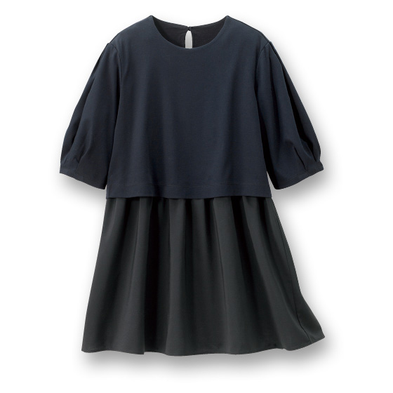 上部分はカットソー、下部分は布帛で重ね着風に見えるドッキングデザイン。表側カットソーは綿100%でほどよい光沢感があり、布帛はペプラムシルエットで上品な印象に。