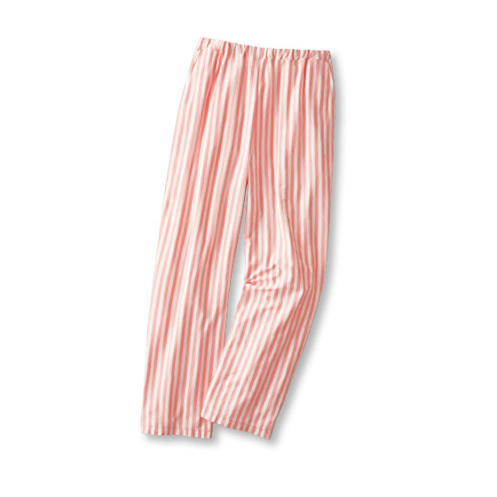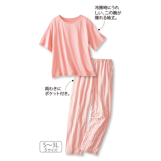 レーヨンのとろみが、肌になめらかな綿混カットソー。ストライプ柄のパンツで、お部屋時間の気分をアップ!