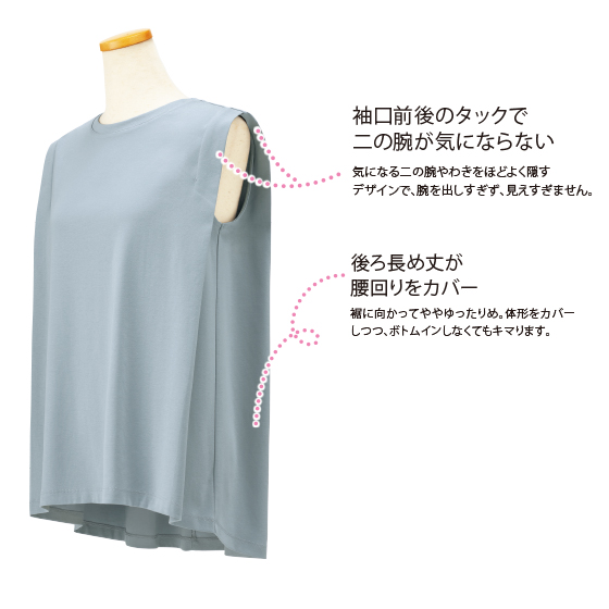 袖口前後のタックが、気になる二の腕やわきをほどよく隠すデザインで、腕を出しすぎず、見えすぎません。特殊加工でシワになりにくい!ハリと光沢感のある上品な素材は、繊維によじれを改質する加工済み。