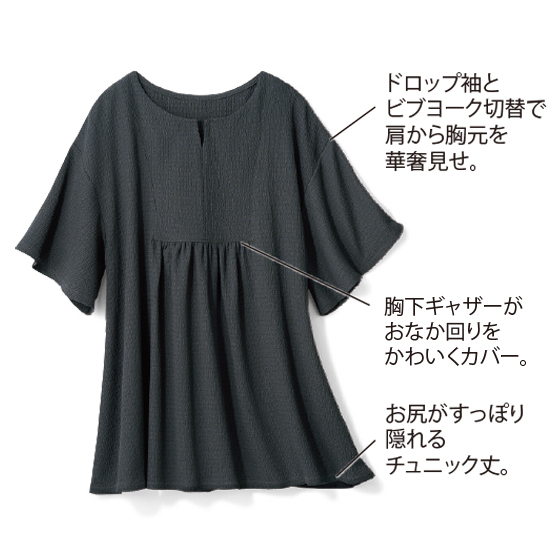 ポコポコとした表面感のあるカットソー素材。伸縮性があるので着心地がよく、ギャザーやフレア使いで体形カバーも。