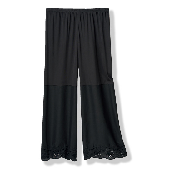 トップスと重なる部分はサラ薄素材、ひざ下は涼しげな綿素材で切替。股ズレを軽減してはきやすく、裾レースで華やぎもプラス。ウエスト総ゴム仕様で楽ちん。※夏におすすめです。