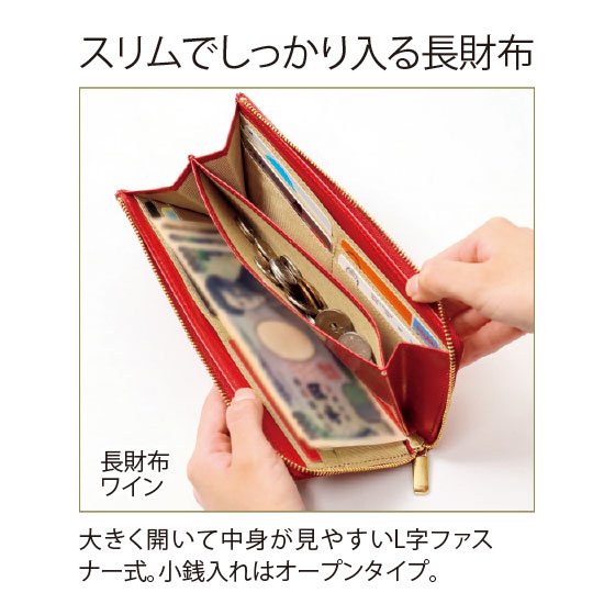 ●仕様:開閉=L字ファスナー式、ポケット=内部にオープン式小銭入れ1個・札入れ2個・カード入れ4個付き