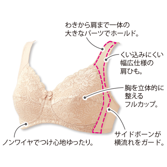 ノンワイヤーで肌触りがよいです。肩ひもが短いのとアンダーベルトが頼りないのが惜しいですね。ぜひ改良してほしいです。ブラのカップ形状も横の切り替えが目立ちます。