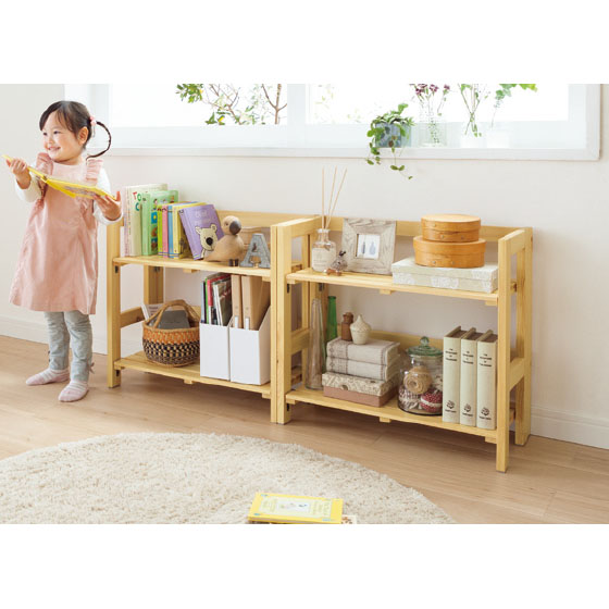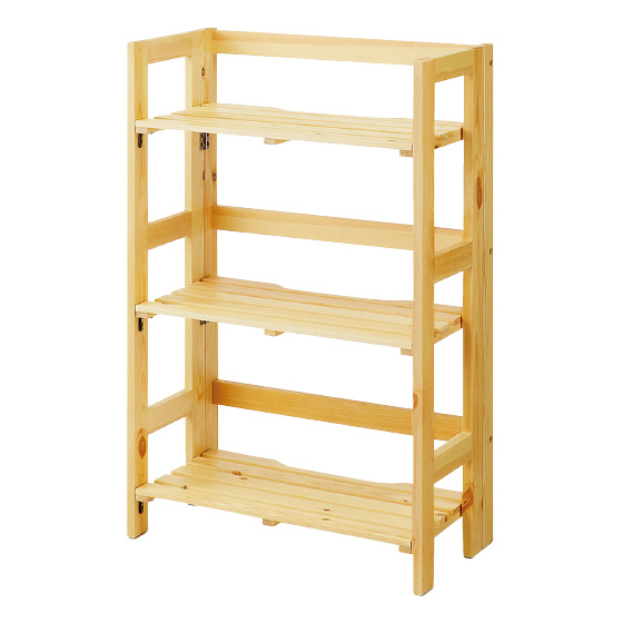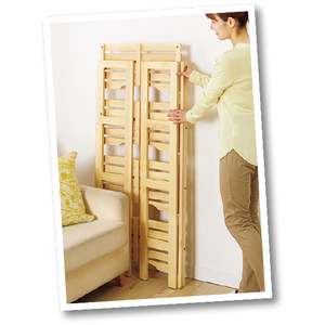 天然パイン材のシンプルデザイン。使わないときはたたんで部屋の隅にしまえます。棚板をパタンと立てて長い物を収納。