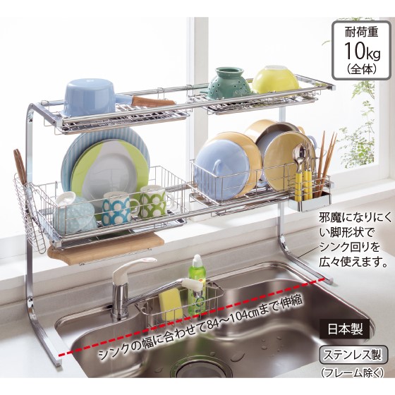 ●サイズ:幅84〜104×奥27×高44(1段)・65(2段)cm、バスケット=幅41×奥20.5×高14.5cm