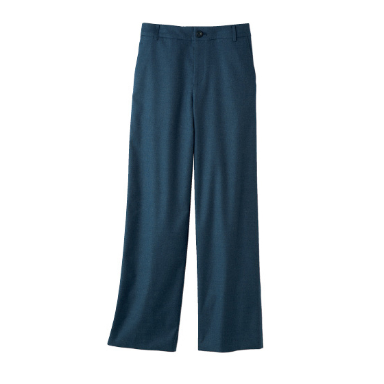 ウエストから裾へ一直線に落ちて、脚ラインをすっきり見せるフル丈ワイド。ウエストには前カーブ、後ろは平ゴム使いで、おとながラクに心地よくはけるパターンです。