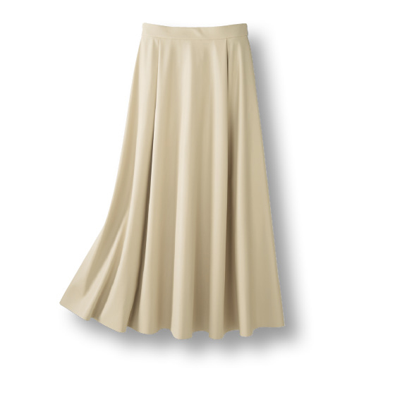 上質感のあるやわらかい合皮生地をたっぷり使ったスカート。腰回りはすっきり、裾に向かってドレープの出る美シルエットです。※春秋冬、3シーズン着用できます。