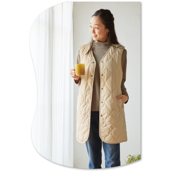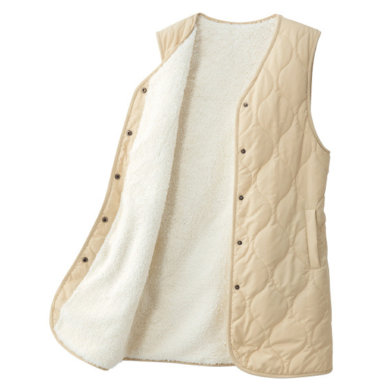 表は薄わた入りウエーブキルト、裏はボアの2枚仕立て。袖なしで家事がラク。脱ぎ着しやすいスナップ留め。