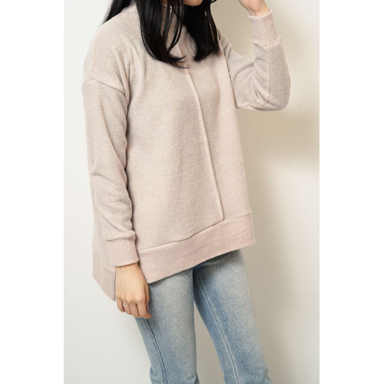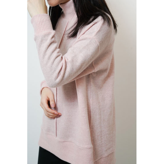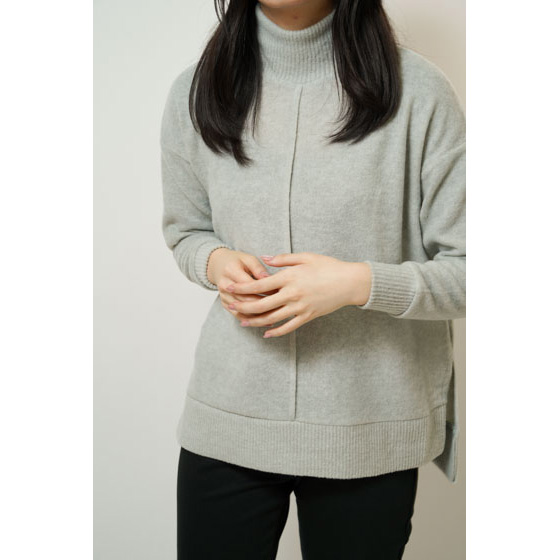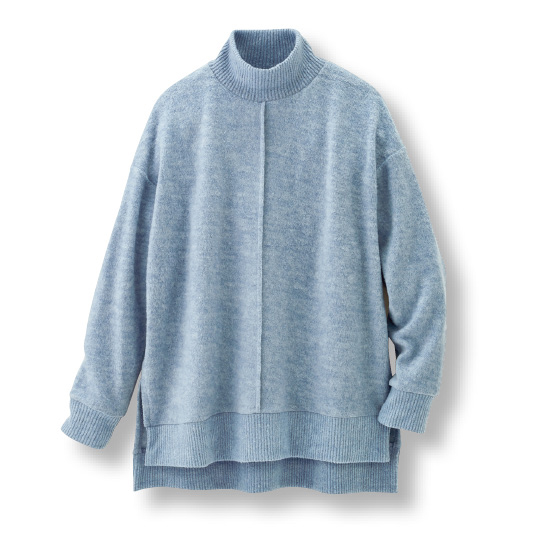 見た目はニットなのに、カットソー素材を使用。洗濯機で洗えて吊り干しもできるから、お手入れもラク。首元の太めリブがオシャレなアクセント。