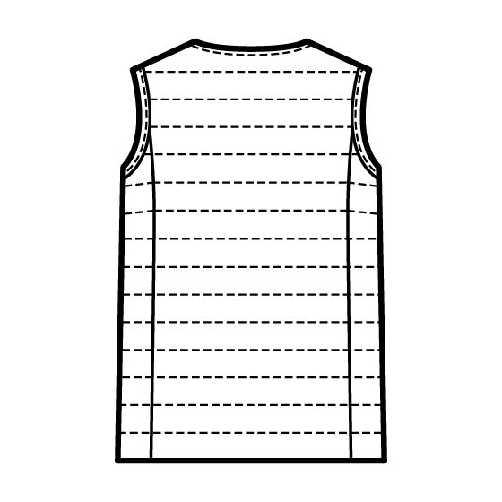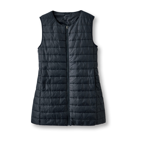 ロング丈で腰まで暖かい。薄くて軽く快適な着心地の中わたベスト。