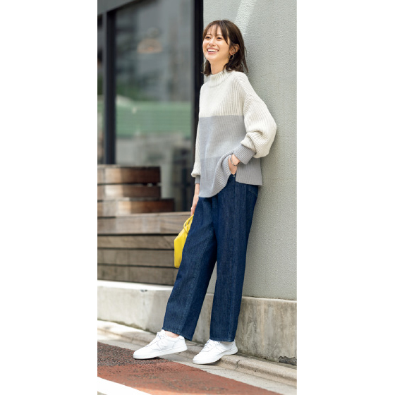 両畦編みのざっくり感とゆるシルエットが、体の線を隠して1枚できれい見え。寒い日にはネックからシャツ衿を、裾からカットソーをのぞかせて重ね着も楽しめます。厚めニットなのに洗濯がラク。肩や袖ぐりにテープをはさんだ伸びにくい仕立て。