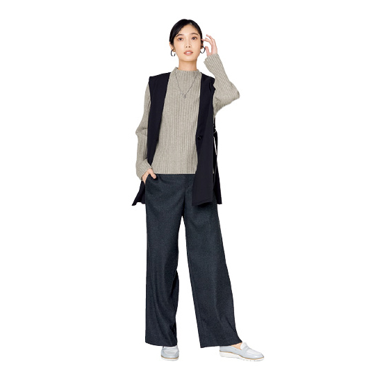 太めのリブが効いたプルオーバーと、ミラノリブ編みAラインスカートのセット。もちもち感のある伸縮ニットで着心地ラクちん。毛玉になりにくく、お手入れも簡単です。※冬に着用できます。